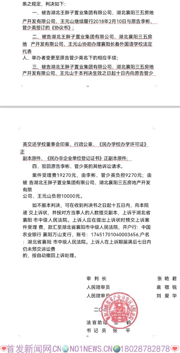 襄阳长春外国语学校与湖北王胖子置业集团有限公司的合同纠纷案,经过一审、二审、再审三次判决:被告湖北王胖子置业集团有限公司、湖北襄阳三五房地产开发有限公司、王元山继续履行2018年2月10日与原告李彬、管少英签订的《协议书》